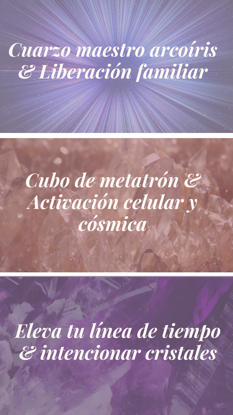 Accede a una biblioteca cristalina de más de 18 ceremonias con sus prácticas, clases de medicina cristalina y meditaciones. Cristales como el cuarzo rosa, cuarzos maestros, cianita, malaquita, selenita y muuuuchos más te esperan!